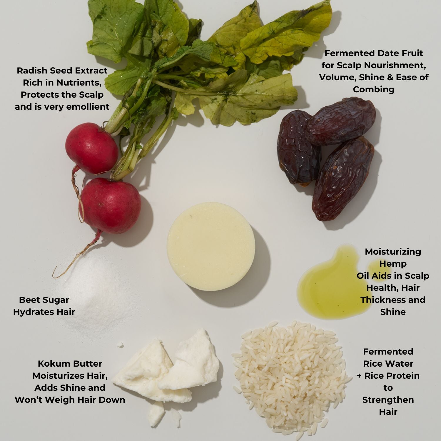 cetyl alcohol, behentrimonium methosulfate*, kokum butter, cannabis sativa (hemp) seed oil, raphanus sativus (radish) seed extract, sambucus nigra fruit extract, limnanthes alba (meadowfoam) seed oil, dl-panthenol, hydroxypropyltrimonium honey, lactobacillus/ date fruit ferment extract, hydrolyzed quinoa protein, oryza sativa (rice) water, hydrolyzed rice protein, leuconostoc/radish root ferment filtrate, saccharomyces ferment, lactobacillus ferment
