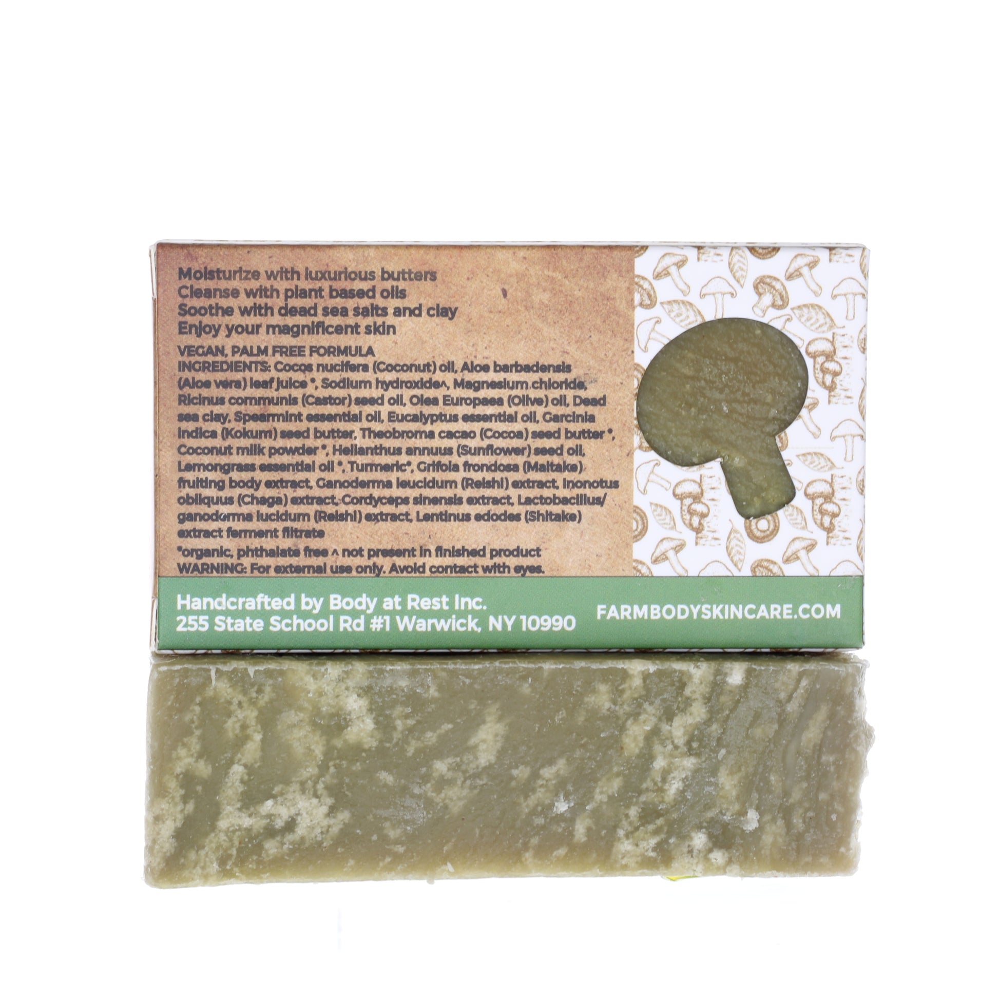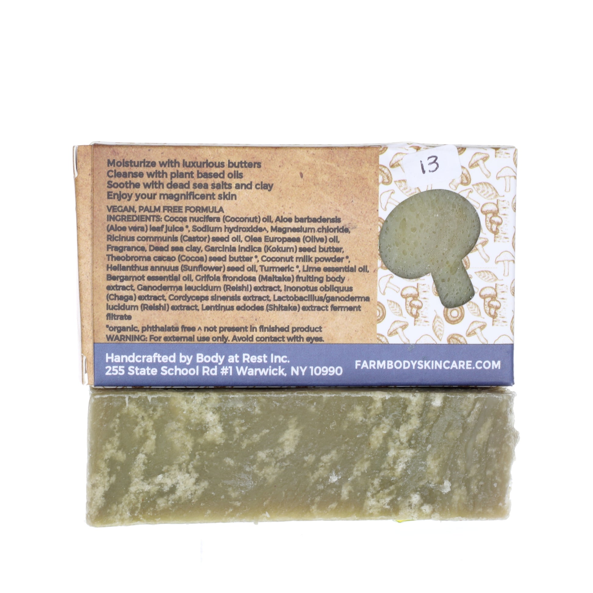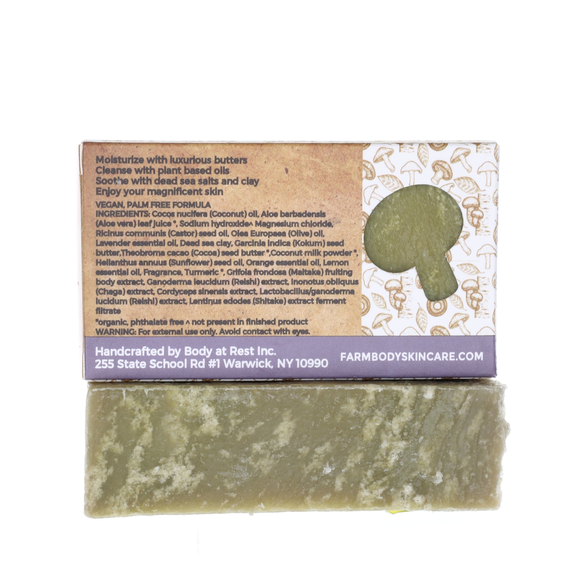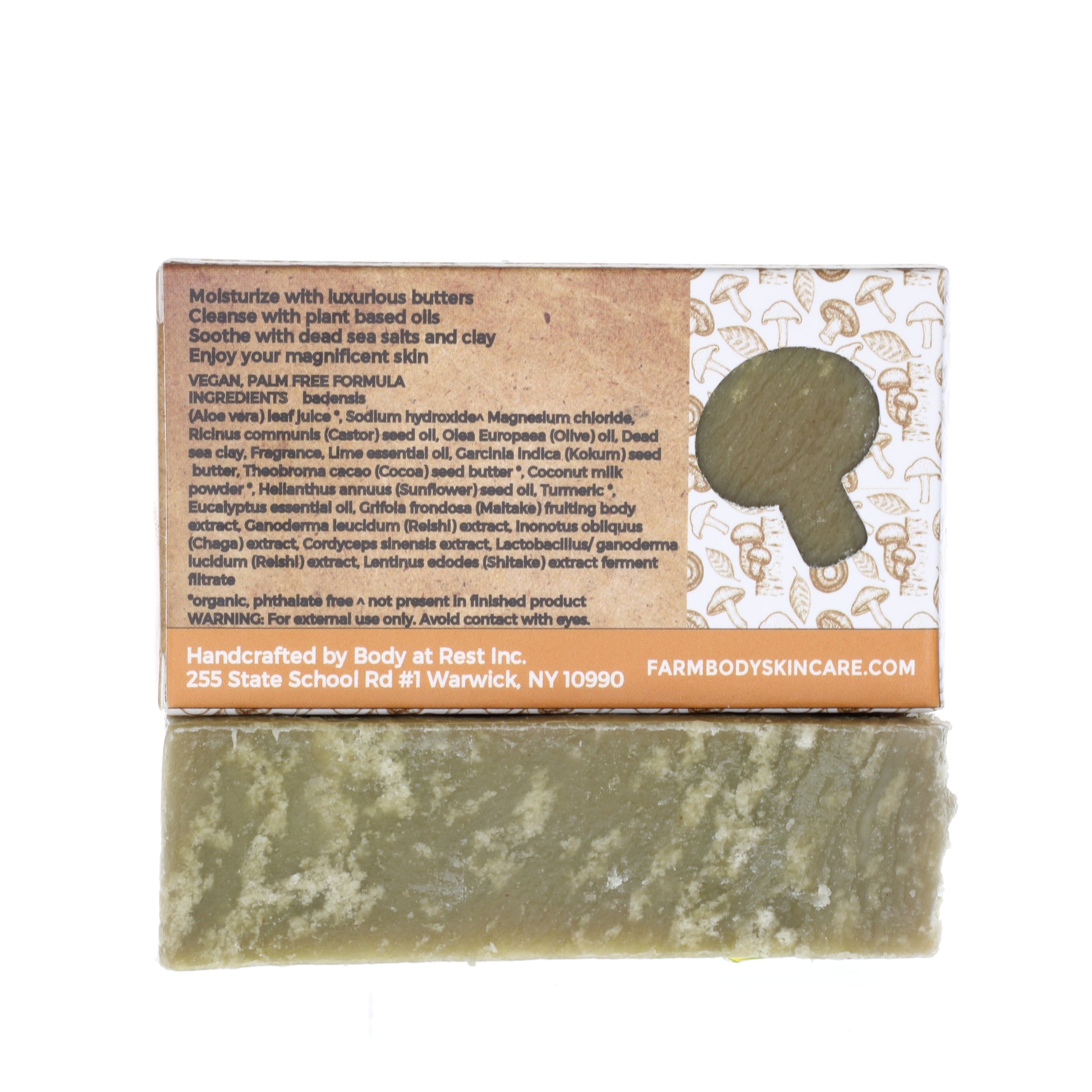 organic coconut oil, organic aloe vera juice, sodium hydroxide*, magnesium chloride, organic castor oil, olive oil, dead sea clay, essential oil blends, kokum butter, cocoa butter, coconut milk, organic sunflower oil, organic turmeric, Maitake mushroom, Reishi mushroom, Chaga mushroom, Cordyceps mushroom, Shiitake mushroom